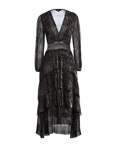 jersey, metallic, ruffles, gathered, solid color, v-neck, long sleeves, partially lined, without pockets, hand wash, do not bleach, do not tumble dry, do not iron, flared dress