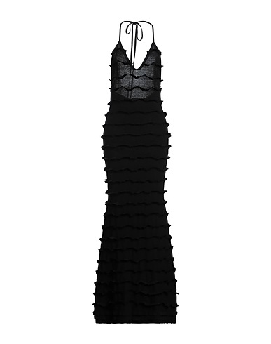 flared dress, knitted, lightweight knit, solid color, brand logo, ruffles, deep neckline, sleeveless, unlined, machine wash, do not bleach, do not tumble dry