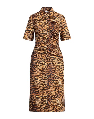 shirt dress, woven, tiger-print, gathered, classic collar, short sleeves, zipper fastening, rear slit, machine wash, do not bleach, do not tumble dry