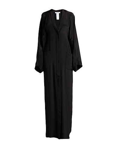 shirt dress, satin, solid color, no appliqués, deep neckline, long sleeves, unlined, snap fastenings, multipockets, dry clean, do not bleach, do not tumble dry