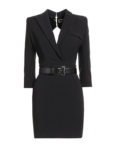 blazer dress, crepe, solid color, brand logo, open back, lapel collar, 3/4 length sleeves, zipper fastening, hook fastenings, slit pockets, stretch, dry clean, do not tumble dry