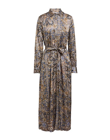 shirt dress, crepe, stretchy fabric, paisley-print, belt, classic collar, long sleeves, buttoned cuffs, unlined, button fastenings, dry clean, do not bleach, do not tumble dry