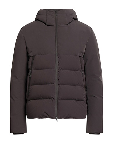 down jacket, shell, stretchy fabric, brand logo, piped trims, solid color, hooded, long sleeves, goose down interior, heavyweight padding, zipper fastening, multipockets, contains non-textile parts of animal origin, machine wash, do not bleach, do not tumble dry