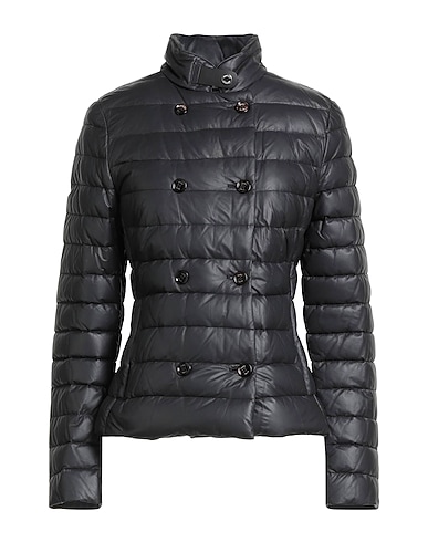 down jacket, leather, no appliqués, solid color, mock neck, long sleeves, goose down interior, lightweight padding, zipper fastening, button fastenings, zipped pockets, contains non-textile parts of animal origin, dry clean, do not bleach, tumble dry