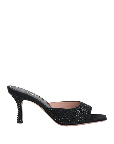 slide sandals, satin, solid color with appliqués, crystals, leather lining, square toe, spool heel, covered heel, leather sole, contains non-textile parts of animal origin