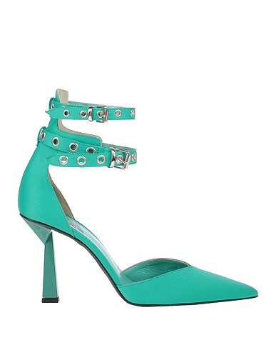 pumps, satin, solid color, brand logo, leather lining, buckle-fastening ankle strap, pointed toe, geometric heel, rubber sole, contains non-textile parts of animal origin