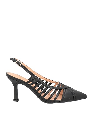 leather, no appliqués, solid color, leather backing, buckle fastening, narrow toeline, spool heel, covered heel, rubber sole, contains non-textile parts of animal origin, slingback pumps