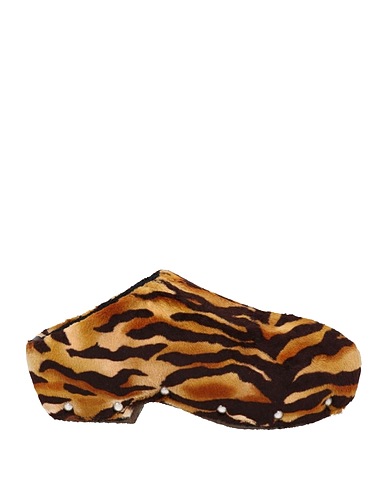 hair plush fabric, no appliqués, animal print, leather backing, round toeline, wedge heel, rubber cleated sole, contains non-textile parts of animal origin, mules model