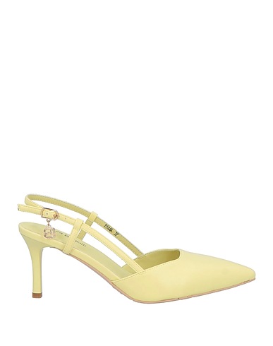 coated fabric, no appliqués, solid color, unlined, buckle fastening, pointed toe, spike heel, rubber cleated sole, slingback pumps