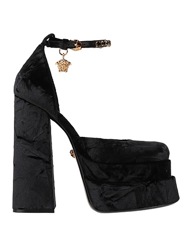 pumps, velvet, solid color with appliqués, brand logo, metal applications, leather lining, buckle-fastening ankle strap, square toe, square heel, covered heel, leather sole, contains non-textile parts of animal origin
