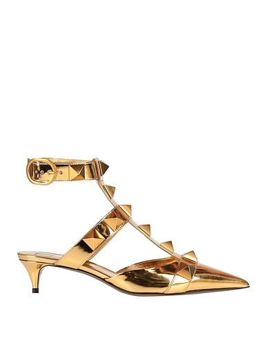 leather, metallic, studs, solid color, leather lining, buckle-fastening ankle strap, pointed toe, spike heel, leather sole, contains non-textile parts of animal origin, t-bar