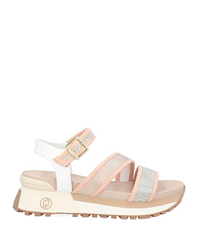 coated fabric, suede effect, glittered, brand logo, multicolor, fully lined, buckle-fastening ankle strap, round toe, wedge heel, rubber cleated sole, ankle strap sandals