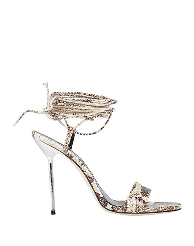 sandals, textured-leather, snakeskin-print, no appliqués, leather lining, ties at ankle, round toe, spike heel, leather sole, contains non-textile parts of animal origin