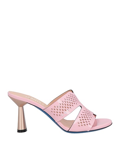 slide sandals, patent leather, perforated, solid color, no appliqués, leather lining, round toe, spool heel, leather sole, contains non-textile parts of animal origin