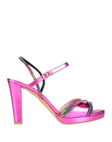 ankle strap sandals, coated fabric, metallic, solid color with appliqués, buckle, lined interior, buckle-fastening ankle strap, round toe, cone heel, rubber sole