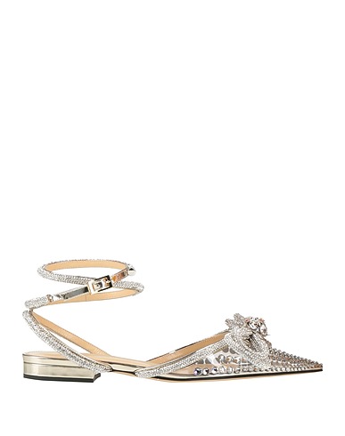 ballet flats, leather, plastic, metallic, solid color with appliqués, crystals, leather lining, buckle-fastening ankle strap, pointed toe, flat, leather sole, contains non-textile parts of animal origin