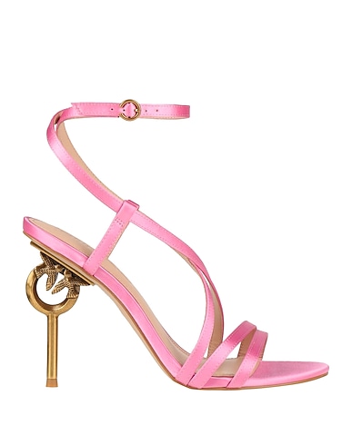 ankle strap sandals, satin, solid color, no appliqués, leather lining, buckle fastening, round toe, sculpted heel, metal heel, rubber sole, contains non-textile parts of animal origin