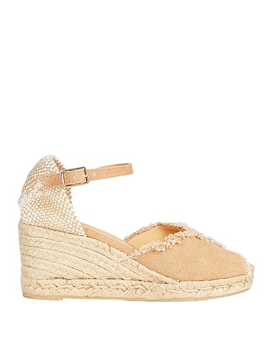 espadrille sandals, canvas, two-tone, no appliqués, fabric inner, buckle-fastening ankle strap, round toe, wedge heel, rope wedge, rubber sole, contains non-textile parts of animal origin, relax by the pool or vacation at the beach in style with this effortless summer holiday outfit
