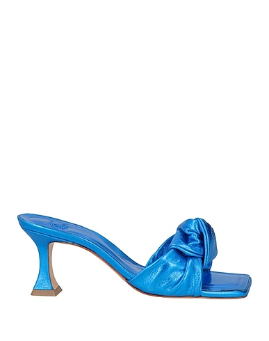 slide sandals, leather, metallic, solid color, bow-detailed, leather lining, pointed toe, spool heel, covered heel, leather sole, contains non-textile parts of animal origin