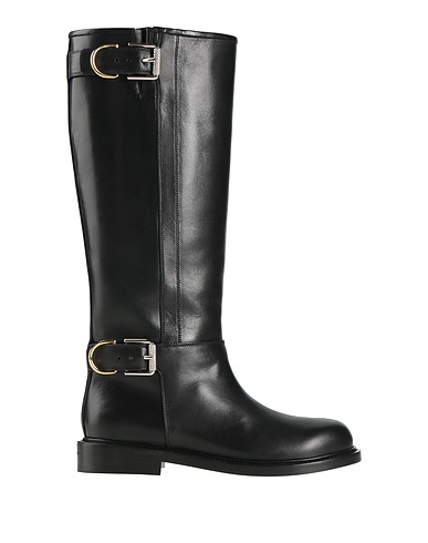 riding boots, leather, strap detailing, brand logo, solid color with appliqués, leather lining, elasticized inserts, buckle fastening, round toe, flat, leather sole, contains non-textile parts of animal origin