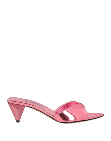 slide sandals, patent leather, metallic, solid color, no appliqués, leather lining, pointed toe, geometric heel, leather sole, contains non-textile parts of animal origin