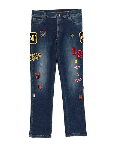 denim, contrasting applications, solid colour with appliqués, medium wash, zipper closure, button closing, multipockets, stretch, wash at 30° c, do not dry clean, do not bleach, do not tumble dry, iron at 110° c max, straight-leg model