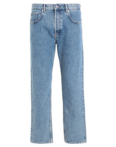 denim, faded, brand logo, solid color, medium wash, high waisted, button closing, five pockets, tapered model