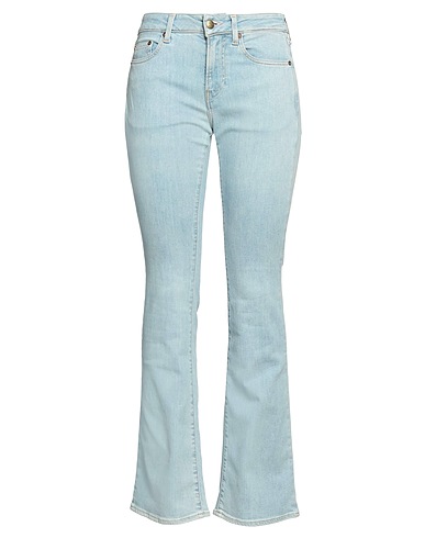 denim, faded, brand logo, solid color, light wash, mid rise, flared cut, regular fit, zipper fastening, 1 button, multipockets, stretch, flare & wide-leg