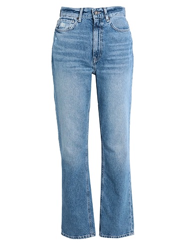 denim, faded, distressed, no appliqués, solid color, medium wash, high waisted, belt loops, regular fit, 1 button, zipper fastening, machine wash or dry clean, do not bleach, do not tumble dry, straight-leg jeans
