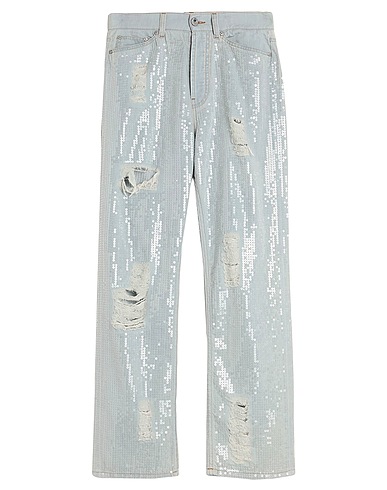 denim, distressed, sequins, solid color, light wash, high waisted, regular fit, button fastenings, multipockets, hand wash, do not bleach, do not tumble dry, contains non-textile parts of animal origin, straight-leg jeans