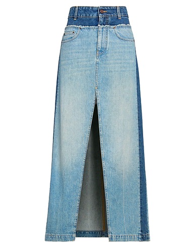 flared skirt, denim, faded, brand logo, solid color, medium wash, belt loops, unlined, 1 button, zipper fastening, front slit, multipockets, machine wash, do not bleach, do not tumble dry, this brand runs large