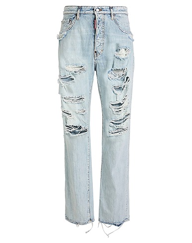 denim, faded, distressed, brand logo, solid color, light wash, high waisted, regular fit, concealed button fastenings, without pockets, hand wash or dry clean, do not bleach, do not tumble dry, straight-leg jeans