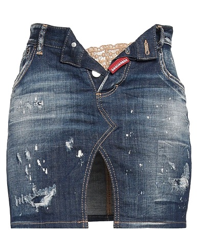 denim, faded, distressed, brand logo, solid color, medium wash, belt loops, button fastenings, multipockets, stretch, machine wash or dry clean, do not bleach, do not tumble dry, pencil skirt