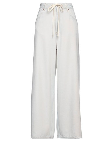 wide-leg jeans, denim, faded, solid color, brand logo, light wash, high waisted, drawstring waist, regular fit, 1 button, zipper fastening, pockets, machine wash or dry clean, do not bleach, do not tumble dry