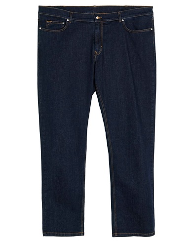 tapered jeans, denim, stretchy fabric, solid color, brand logo, dark wash, high waisted, regular fit, five pockets, machine wash or dry clean, do not bleach, do not tumble dry