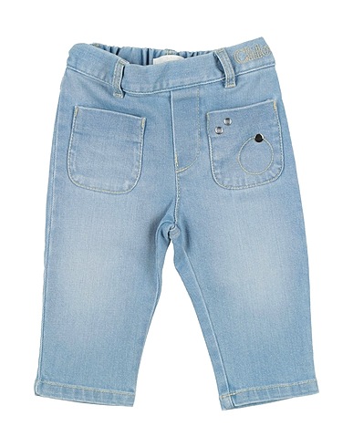 denim, solid color, embroidered logo, light wash, elasticized waist, multipockets, stretch, machine wash, do not bleach, do not tumble dry, this brand runs large