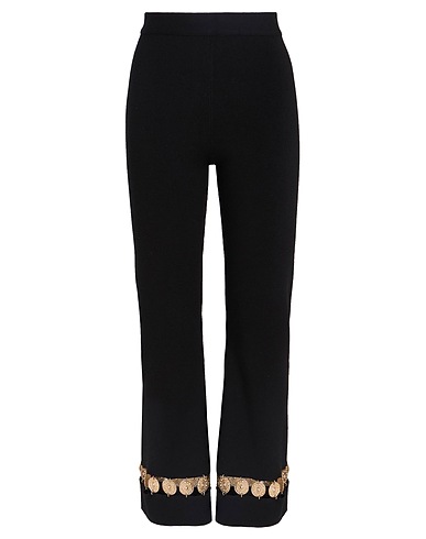 flared pants, knitted, lightweight knit, solid color with appliqués, embellished, high waisted, regular fit, stretch, dry clean, do not bleach, do not tumble dry, cropped