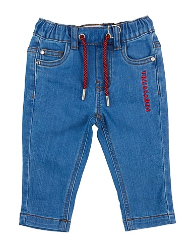 denim-jersey, stretchy fabric, solid color with appliqués, embroidered logo, medium wash, elasticized waist, drawstring fastening, five pockets, machine wash, do not bleach, do not tumble dry