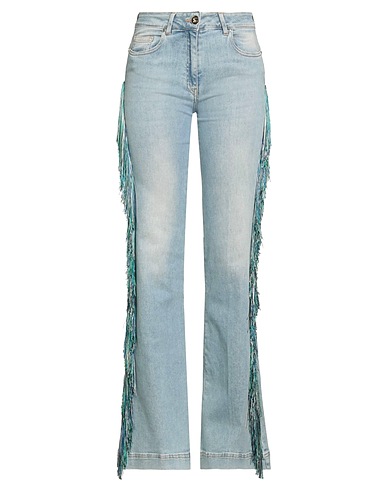 boot-cut jeans, denim, faded, stretchy fabric, solid color with appliqués, fringes, brand logo, light wash, mid rise, belt loops, regular fit, zipper fastening, 1 button, five pockets, machine wash or dry clean, do not bleach, tumble dry