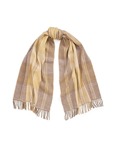 scarf, knitted, medium-weight knit, tartan pattern, fringes, brand logo, double face, dry clean, do not bleach, do not tumble dry, do not iron