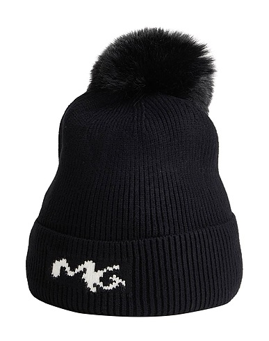 beanie , intarsia-knit, medium-weight knit, solid color with appliqués, brand logo, plush fabric trims, dry clean, do not bleach, tumble dry
