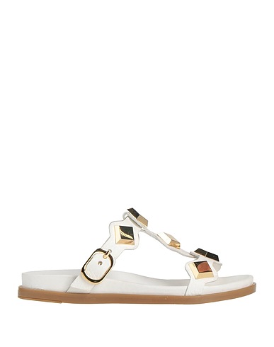 sandals, pebbled-leather, solid color with appliqués, studs, leather lining, round toe, flat, rubber sole, contains non-textile parts of animal origin