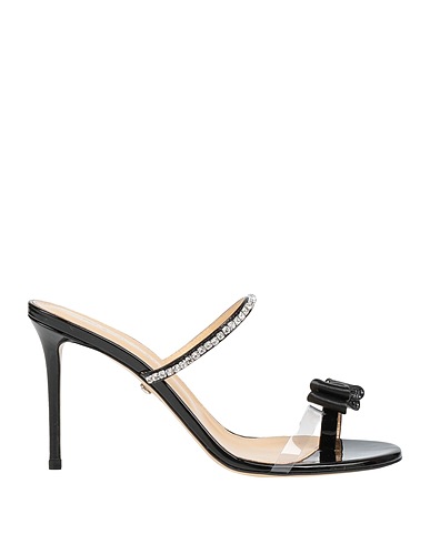 toe strap sandals, plastic, patent leather, solid color with appliqués, bow-detailed, crystals, leather lining, round toe, spike heel, covered heel, leather sole, contains non-textile parts of animal origin