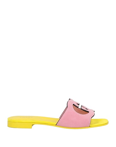 slide sandals, suede, solid color, no appliqués, leather lining, round toe, flat, leather sole, contains non-textile parts of animal origin