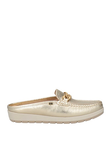 mules, leather, metallic, solid color with appliqués, embellished, leather lining, round toe, flat, rubber sole, contains non-textile parts of animal origin, large sized