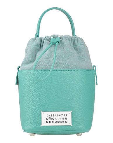 bucket bag, pebbled-leather, canvas, solid color, brand logo, drawstring fastening, fully lined, internal pocket, detachable top handle, detachable shoulder strap, metallic straps, feet at base, small size, contains non-textile parts of animal origin