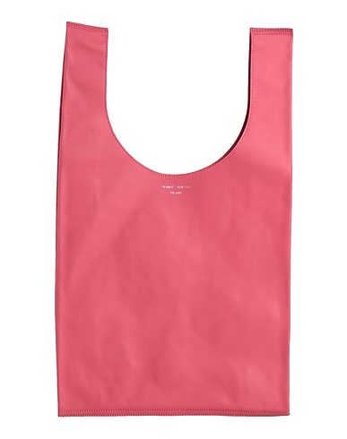 shopper bag, synthetic material, solid color, brand logo, unlined, double handle, large size