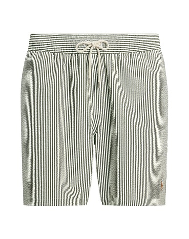 seersucker, striped, embroidered logo, built-in briefs, drawstring waist, stretch, machine wash, do not tumble dry