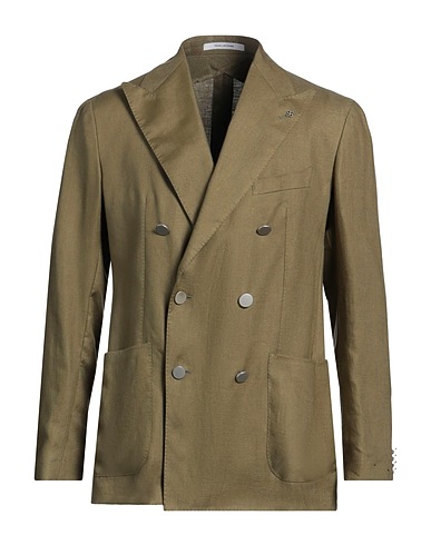 plain weave, no appliqués, solid color, lapel collar, double-breasted, long sleeves, partially lined interior, button closing, multipockets, dual back vents, double-breasted jacket
