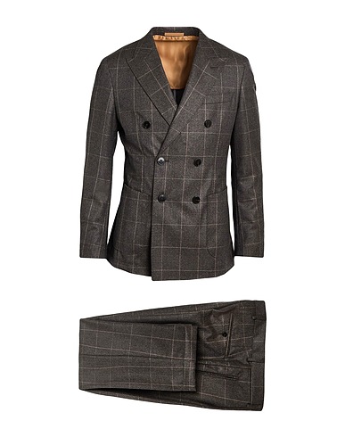 double-breasted suit, wool, flannel, checked, no appliqués, lapel collar, long sleeves, buttoned cuffs, partially lined, button fastenings, multipockets, high waisted, dry clean, do not bleach, do not tumble dry